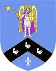 Description: Au chef à l’archange (Saint Michel) et une étoile à sept rais d’or, en dextre; Sur un chevron borduré d’or, à 3 merlettes d’argent mal ordonnées; une Fleur de Lys d’argent, en pointe[53] |