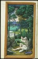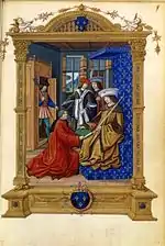 - Un deuxième livre d'heures (manuscrit Walters W. 451) porte la même devise, mais on n'indique rien concernant son copiste. Les enluminures ont probablement été ajoutées à un manuscrit antérieur[31]. Contient sept miniatures pleine page[32] qui reproduisent, presque à l'identique, une tour blanche avec un prisonnier agitant une banderole à travers une fenêtre grillagée. Elles diffèrent par l'apparition dans le ciel d'une crucifixion, de la Vierge, de la Visitation. Ces peintures sont une allusion à l'emprisonnement de Jean le jeune[31].
