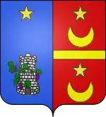 Parti au 1 : d'azur, à la tour ouverte, ajourée et crénelée, maçonnée de sable, entourée d'un cep de vigne de sinople; au 2 : de gueules, à la fasce d'or en devise, accompagnée en chef et en pointe par deux croissants d'or surmontés chacun d'une étoile du même[3].