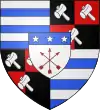 Armes portées actuellement | Écartelé aux 1 et 4, fascé d'argent et d'azur à six pièces ; aux 2 et 3, contre-écartelé de sable et de gueules à trois maillets d'argent brochant sur l'écartelé (armes anciennes)[102] ;