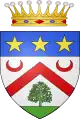 | Blasonnement | D'argent, au chevron de gueules surmonté de deux croissants de même, au buisson terrassé de sinople en pointe, au chef d'azur, chargé de trois étoiles d'or[1] | |