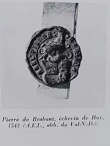 - 1° Pierre (le vieux), échevin de Huy et de Wanze (1541), membre du métier des vignerons, mayeur héréditaire de Waleffe-Saint-Pierre (1560), tenant de la Cour jurée de Notre-Dame des Carmes à Huy ; l’ancien château ferme et la seigneurie de Waleffe-Saint-Pierre étaient tenus par Henry d’Acosse, écuyer, époux de Catherine de Huy, grand-père de Marie d'Acosse.; Pierre de Brabant fut chargé avec le fourrier Antoine Mureau par le Prince-évêque Georges d’Autriche le 6 mai 1552 d’empêcher les gens de guerre de commettre des dégâts dans le pays et les chanoines tréfonciers de la Cathédrale le prièrent en 1560 de remettre la cour en activité[13], + 23 mai 1573, x Marie d'Acosse laquelle testa le 23 janvier 1582 et laissa divers biens à ses neveux, Pierre (le jeune), ainsi qu’à Godefroid et Charles de Brabant, enfants de Godefroid et Jeanne Menjoye, + 9 mars 1584, fille de Gilles et de Marie Bozea de Thiribu. Sans postérité. Pierre reçut une sépulture en l'église des Dames Blanches à Huy en armes, portant les quartiers Brabant - Sywalart - Acosse - Bozeal de Thiribu. Son épouse Marie fut inhumée dans une sépulture collective à Waleffe-Saint-Pierre où reposaient Henry d'Acosse jadis échevin de la cour de Wanze (+ 21 juillet 1507), Sibylle Sywalart, femme de de Jean V, (+ 21 septembre 1538), Pierre de Brabant (le jeune) et son épouse Jehenne de Remikette.