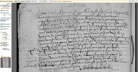 - 1752.07.18 - Acte de mariage Alain de Nicolas de La Coste x Françoise Martine de Planchard - Registre BMS 1740-1752 de la commune Monceaux-sur-Dordogne (Corrèze)