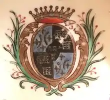 | Blasonnement | Écartelé au 1 et 4 d’azur à deux truites adossées d’argent, écaillées de gueules, cantonnées de quatre croisettes recroisetées d’argent au pied fiché d’or ; au 2 et 3 de sable à trois herses d’argent; sur le tout : de sable à trois tours d’argent posées deux et un |