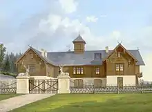 En détail : dans un écu rouge, trois barres transversales bleues inclinées (du côté supérieur droit au côté inférieur gauche) incrustées de frêne blanc, au-dessus de celle du milieu une petite croix d'argent. Le bijou est une bannière rouge bordée de blanc à trois barres comme sur un bouclier, issue d'un casque couronné sur un mât rouge et blanc avec une pointe d'or. Les couvertures sont rouge-bleu. Les armoiries complètes comprennent également deux dragons rouges (griffons) comme porteurs de bouclier et la devise Dieu et mon roi (À Dieu et mon roi)[8].