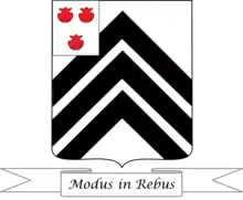 Armes de famille: d’argent à trois chevrons de sable ; au franc-canton cousu du champ et chargé de trois coquilles de gueules. L’écu timbré de la couronne de Chevalier, surmontée d’un heaume d’argent, couronné, grillé et liseré d’or, doublé de gueules, aux lambrequins d’argent et de sable. Cimier : une coquille de gueules entre un vol d’argent et de gueules. Devise : “Modus in Rebus”, de sable sur un listel d’argent.