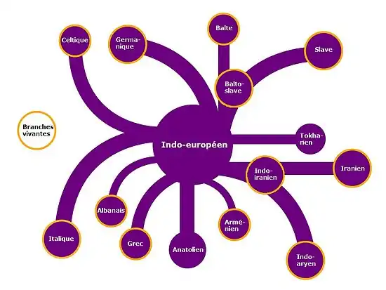 Par exemple, la famille des langues indo-européennes est constituée des branches celtique, italique (y compris les langues romanes), germanique, balto-slave, indo-iranienne, tokharienne et anatolienne ainsi que de plusieurs langues qui forment des branches à elles toutes seules, notamment l'albanais, le grec et l'arménien.