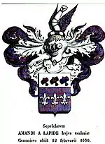- Amand vdS, dit a Lapide[23], († Tongres, ) - dont épitaphe ci-contre. Seigneur de plusieurs fiefs nobles de la vicomte de Denderleeuw augmenta à ce sujet ses armes des trois fleurs de lys d'argent qui sont les armoiries de la vicomté de Leeuw et du comté de Lombeek. Suivant un usage répandu aux Pays-Bas aux XVIe et XVIIe siècles il latinisa son nom de van den Steen en celui de A Lapide. Il réfusa une prébande au grand chapitre des Tréfonciers à la cathédrale de Liége que lui offrait le prince évêque Ferdinand de Bavière et resta chanoine grand chantre archidiacre de l'église collégiale et archidiaconale de Tongres où sa pierre tumulaire est placée depuis le . Dans les cloîtres de la même église on voit une pierre tumulaire de la famille de Kerckem portant huit quartiers parmi lesquels le quartier van den Steen.
