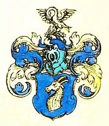 Les armoiries de la famille montrent une tête et un cou en argent tournés latéralement d'une chèvre (ou d'un bélier) dans le bouclier bleu. Sur le casque aux lambrequins bleus et argentés un pélican tourné vers la droite sur le nid nourrit ses trois poussins.