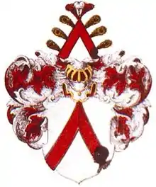Les armoiries de la famille montrent en argent un chevron rouge (1315) qui s'étend jusqu'au bord supérieur de l'écu. Plus tard (1409), une tête de maure (de) regardant vers le haut apparaît sur la branche gauche, posée en biais à gauche. L'image héraldique d'origine était un chevron, accompagné d'une coupe en verre sur les sceaux plus anciens. L'ambiguïté du dessin aurait donné naissance à la tête de maure. Sur le heaume aux lambrequins rouges et argentés, un chevron rouge à tête noire comme dans l'écu, avec trois plumes de paon naturelles sur chaque branche et trois plumes d'autruche (de) en pointe, dont celle de droite est noire, celle du milieu rouge et celle de gauche argentée.