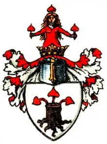 - Les armoiries de la famille montre en or (ou en argent) un tronc d'arbre noir déraciné d'où poussent trois feuilles rouges. Sur le casque aux lambrequins rouge-or (rouge-argent) se trouve une Vierge grandissante, vêtue de rouge et couronnée, tenant une feuille rouge dans chaque main, sa couronne ornée d'une feuille rouge.