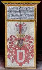 Les armoiries de la famille montrent un bouclier de gueules bordé d'argent dans un bouclier de gueules; en héraldique , sur fond rouge, un intérieur argenté . Sur le casque aux lambrequins de gueules et argent, trois plumes d'autruche (de) (rouge, argent, rouge) poussent à partir d'un renflement rouge et argent, qui à son tour est couronné de trois roses rouges, entre lesquelles se dressent deux petits drapeaux flottant vers l'extérieur, divisés en rouge sur argent. Les drapeaux sont souvent représentés divisés en argent sur rouge.