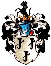 Les armoiries montrent en argent 3 (2, 1) cors de chasse ou crochets de puits noirs, rouges à l'intérieur, posés en biais à gauche et surmontés d'un crochet noir. Sur le heaume couronné aux couvertures noires et argentées, un lévrier noir en pleine croissance avec un collier d'or.
