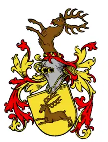 1702 : Le blason en or, dessus un cerf naturel bondissant ; sur le casque avec lambrequin rouge et or : le cerf croissant.