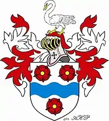 Les armoiries montrent en argent une barre ondulée bleue accompagnée de trois (2: 1) roses rouges. Un cygne argenté sur le casque avec des lambrequins de gueules et argent.
