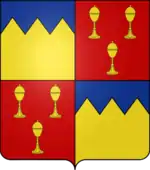 • D'or au chef d'azur emmanché de deux pièces et deux demies écartelé de gueules à 3 coupes ouvertes d'or posées 2 en chef et 1 en pointe[30],[33]