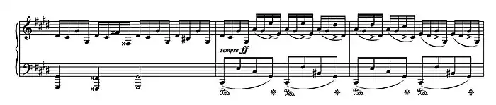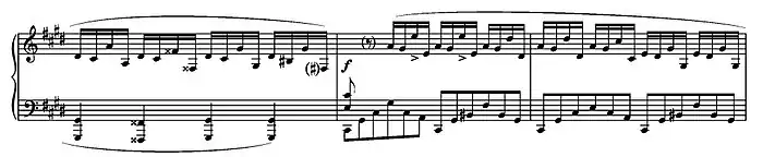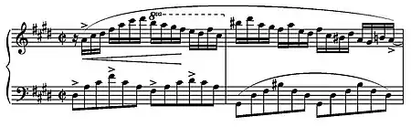, instaure dans l'énoncé motif, indiqué allegro agitato, un système polyrythmique — la main droite joue des doubles croches tandis que la main gauche joue des sextolets de croches — et déploie une figuration de notes sans cesse en mouvement. Cette section s'achève sur une énergique descente chromatique con forza, suivie d'une cadence de virtuosité tout aussi éclatante.