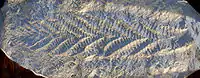 | Moule de Charnia, le premier organisme complexe du Précambrien reconnu en tant que tel. Il fut un temps rattaché au groupe des pennatules. | ![]() |