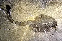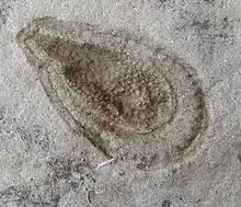 | Spriggina, un possible précurseur des trilobites aurait pu être l'un des prédateurs ayant mené à la disparition de la faune de l'Édiacarien[31] et à la diversification des animaux au Cambrien[32]. | ![]() |