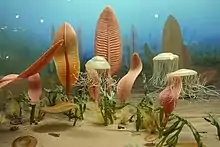 Les organismes de l'Édiacarien apparurent vers −585 Ma et s'épanouirent jusqu'à la veille du Cambrien il y a 542 Ma lorsque les caractéristiques de ces fossiles disparurent. Si les premiers fossiles de cette période ont été découverts dans les années 1860, il faudra attendre les années 1960 pour que l'on réalise qu'ils représentaient une toute nouvelle forme de vie jusque-là inconnue. Si de rares fossiles pouvant représenter des survivants ont été découverts jusque dans le Cambrien moyen (510-500 Ma), les dernières communautés disparurent à la fin de l'Édiacarien laissant uniquement d'étranges fragments d'un écosystème florissant[5]. Il existe de nombreuses hypothèses pour expliquer cette disparition, dont un « biais de conservation » (ils ont peut-être évolué, mais leur descendance ne s'est pas conservée ou bien les couches respectives ont été ultérieurement arasées), un changement environnemental (par exemple climatique) ou encore l'apparition de la prédation et la compétition avec d'autres formes de vie.