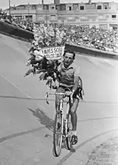 Pour la troisième et dernière fois de sa carrière, Fausto Coppi remporte la classique Milan-San Remo en début de saison 1949. Il s'impose seul, avec plus de 4 minutes d'avance sur le deuxième. En avril, il gagne au vélodrome Vigorelli un match de poursuite contre Gerrit Schulte, qu'il a battu auparavant lors d'une des deux seules poursuites auxquelles il a participé durant l'hiver. Trois jours plus tard, il est troisième de la Flèche wallonne, remportée par Rik Van Steenbergen qui est revenu dans la final grâce à l'aide des voitures suiveuses[36]. Il dispute son premier Paris-Roubaix. Il en prend la douzième place tandis que son frère Serse, vainqueur du sprint du peloton, est déclaré vainqueur ex æquo neuf mois après la course : à l'arrivée, les coureurs de tête sont mal aiguillés, n'arrivent pas au vélodrome de Roubaix par l'entrée prévue et les frères Coppi posent une réclamation qui ne trouve une réponse définitive qu'au congrès de l'UCI en fin d'année.