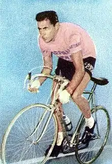 Angelo-Fausto Coppi, dit Fausto Coppi[Note 1], né le à Castellania dans le Piémont et mort le à Tortone, est un cycliste italien. Professionnel de 1940 à 1959, il est considéré comme l'un des plus grands coureurs de l'histoire du cyclisme, ce qui lui vaut le surnom de « campionissimo ». Premier coureur à réaliser le doublé Tour d'Italie-Tour de France en 1949 (exploit réédité en 1952), il remporte notamment cinq Tours d'Italie, deux Tours de France, cinq Tours de Lombardie, trois Milan-San Remo, un Paris-Roubaix, une Flèche wallonne, quatre Championnats d'Italie sur route et trois championnats du monde : un sur route et deux en poursuite. Il détient également le record de l'heure de 1942 à 1956. Sa carrière a été marquée par sa rivalité avec Gino Bartali. Coureur complet, son palmarès compte des victoires majeures dans différents types de compétition, sur route et sur piste. Il a acquis nombre de victoires au bout de longues échappées solitaires.