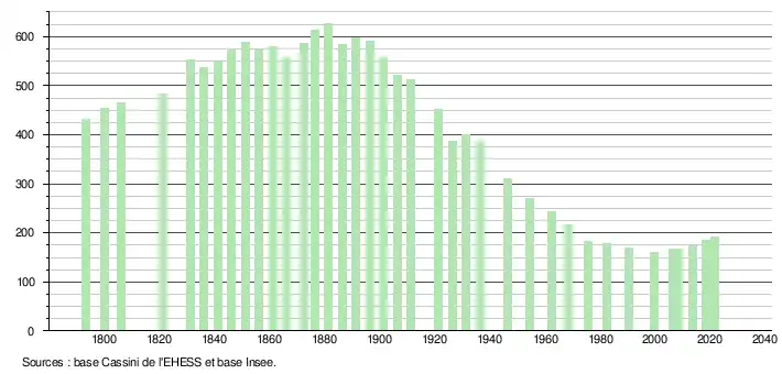 L'évolution du nombre d'habitants est connue à travers les recensements de la population effectués dans la commune depuis 1793. Pour les communes de moins de 10 000 habitants, une enquête de recensement portant sur toute la population est réalisée tous les cinq ans, les populations légales des années intermédiaires étant quant à elles estimées par interpolation ou extrapolation[22]. Pour la commune, le premier recensement exhaustif entrant dans le cadre du nouveau dispositif a été réalisé en 2008[23].