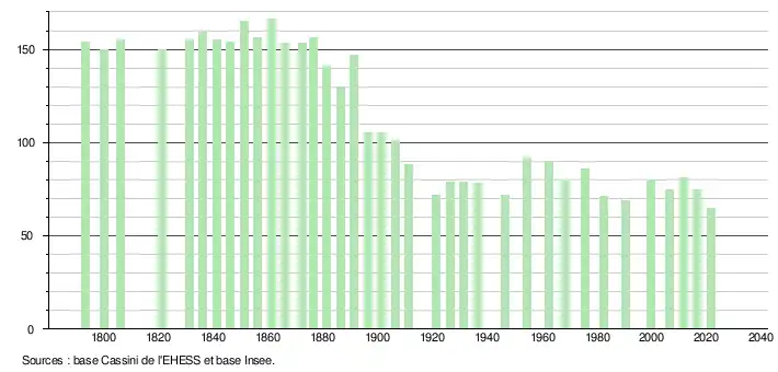 L'évolution du nombre d'habitants est connue à travers les recensements de la population effectués dans la commune depuis 1793. Pour les communes de moins de 10 000 habitants, une enquête de recensement portant sur toute la population est réalisée tous les cinq ans, les populations légales des années intermédiaires étant quant à elles estimées par interpolation ou extrapolation[16]. Pour la commune, le premier recensement exhaustif entrant dans le cadre du nouveau dispositif a été réalisé en 2006[17].