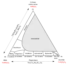 | Nom | % NaAlSi3O8 | % CaAl2Si2O8 | Densité (g/cm3) |