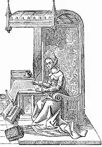 Au Moyen Âge, les femmes avaient l'habitude d'œuvrer aux côtés des hommes : l'enluminure, la broderie, ou les lettrines sont des exemples courants de la production artistique féminine de l'époque. Brasseuses, bouchères, marchandes de laine ou de quincaillerie… autant d'activités exténuantes auxquelles les femmes artistes échappaient par leur appartenance aux classes sociales lettrées, aristocrates (plus portées sur la broderie) ou cléricales (se dédiant plus volontiers à l'enluminure).