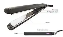 - le variateur de type bouton, qui compte alors deux boutons, un pour baisser la température, l'autre pour l'augmenter, permet ainsi de programmer la chaleur du lissage au degré près.