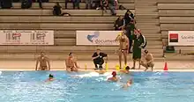 Discussion de l'entraîneur et de l'équipe à la pause d'un match, en octobre 2009. Les joueurs portent des maillots, bonnets et peignoirs vert foncé, la couleur du logotype du club.