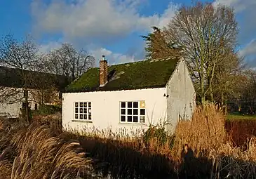 La grange en long du XVIIIe siècle[7] ou du début du XIXe siècle[8]constitue un excellent exemple de la maçonnerie de briques peintes à la chaux blanche, à la base peinte en noir, qui caractérise les fermes brabançonnes.