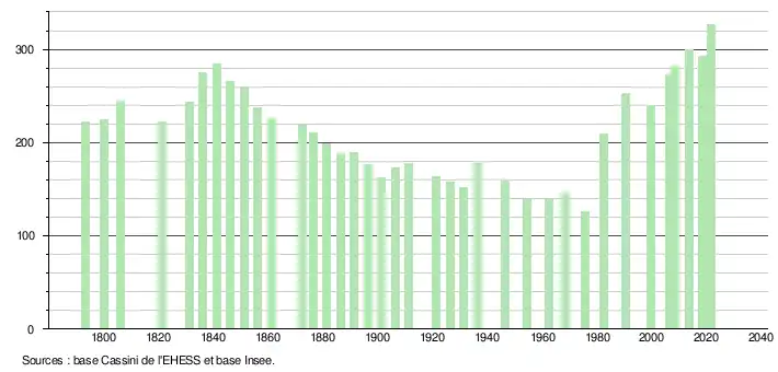 L'évolution du nombre d'habitants est connue à travers les recensements de la population effectués dans la commune depuis 1793. Pour les communes de moins de 10 000 habitants, une enquête de recensement portant sur toute la population est réalisée tous les cinq ans, les populations légales des années intermédiaires étant quant à elles estimées par interpolation ou extrapolation[16]. Pour la commune, le premier recensement exhaustif entrant dans le cadre du nouveau dispositif a été réalisé en 2008[17].
