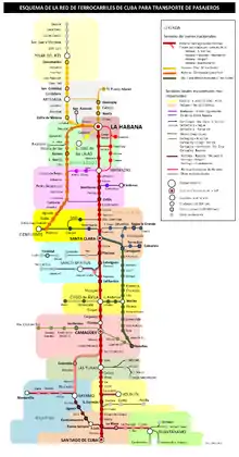 Le réseau des Ferrocarriles de Cuba est d'écartement standard (1 435 mm). Il s'étend de Guane (province de Pinar del Río) dans la partie occidentale de l'île jusqu'à la baie de Guantánamo dans la partie orientale. La plupart des 4 226 km de voies sont en traction diesel, 140 km sont cependant électrifiés.