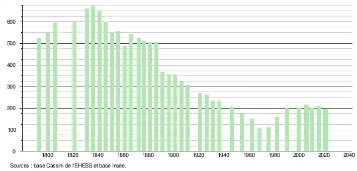 | L'évolution du nombre d'habitants est connue à travers les recensements de la population effectués dans la commune depuis 1793. Pour les communes de moins de 10 000 habitants, une enquête de recensement portant sur toute la population est réalisée tous les cinq ans, les populations légales des années intermédiaires étant quant à elles estimées par interpolation ou extrapolation[25]. Pour la commune, le premier recensement exhaustif entrant dans le cadre du nouveau dispositif a été réalisé en 2005[26]. En 2021, la commune comptait 189 habitants[Note 4], en diminution de 9,13 % par rapport à 2015 (Aude : +2,47 %, France hors Mayotte : +1,84 %). |