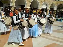 Groupe de joueurs de tambours et zokras dans le vieux souk de Tataouine à l'occasion du festival