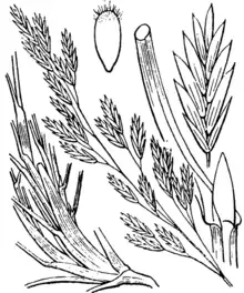 Sa souche est courte, rameuse et fibreuse. Ses feuilles, d'un vert brillant à glauque, sont enroulées à la manière des joncs, épaisses (1 à 1,5 mm) et piquantes. Les feuilles basales sont très longues, souvent arquées, lisses et glabres. Leur ligule est très longue (4 à 7 mm) et souvent fripée. Les fleurs sont panachées de vert, de jaune et de violet et dressées en panicule, dont la tige est fixée isolément ou par binôme. Les épillets sont assez long (de 8 à 10 mm) et contiennent 5 à 8 fleurs. Les glumes sont de taille inégale et aigües. Les glumelles inférieures sont lancéolées et très membraneuses. Elles portent 5 nervures parallèles et sont prolongées par une courte pointe ou une arête. La souche forme également une multitude de rejets stériles sortant des gaines inférieures, ce phénomène se nomme « innovation extravaginale »[1].