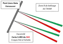À la sortie de l'un des bras les plus fréquentés du port de Vancouver (Colombie britannique) d'à peine 2/10 de MM utile, la carte 3.493 du SHC proposait deux feux à secteurs conventionnels distants de quelque 1/10 MM sur le pont Lions Gate. Ce dispositif probablement unique au monde jouait alors le rôle, sophistiqué, de séparateur de trafic.