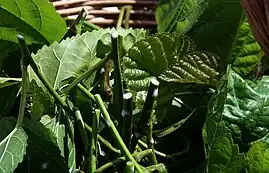 - feuille de mûrier fraiche non séchée: fourrage (vers à soie, animaux), alimentation humaine (smoothie et salades ou brèdes, sous le nom de 桑芽菜 (sāng yá cài) pousses de mûrier elles sont un alicament qui sera préconisé par l'Administration d'État chinoise de médecine lors de l'épidémie de grippe H7N9 en 2013[6].