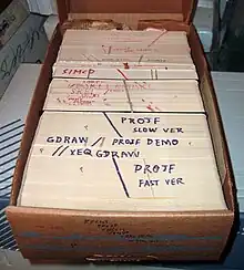 En 1950, les fichiers informatiques se présentaient sous la forme d'une pile de cartes perforées, qu'un appareil lisait sans intervention humaine. Elles pouvaient ainsi être traitées 100 fois plus vite que si les informations avaient été introduites manuellement. De tels fichiers étaient cependant volumineux et ont rapidement été remplacés par des dispositifs de stockage magnétique, plus compacts et plus rapides : une bobine de bande magnétique peut contenir autant d'informations qu'une pile de cartes de 60 mètres de haut et le contenu de la bande magnétique peut être lu 100 fois plus vite que celui d'un fichier de cartes perforées[4].