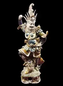 Le lokapala était également trouvé à la surface dans des temples bouddhistes, en pierre ou en bois[58]. Ils semblent représenter une fusion des gardiens taoïstes traditionnels, datant de la dynastie Han, et du dvarapala bouddhiste ou "Rois célestes", qui sont en théorie quatre, bien que souvent seulement deux soient représentés dans d'autres cultures bouddhistes. Ceux-ci aussi ont été montrés comme de "fabuleux semi-humains à crête avec des yeux exorbités, une bouche furieusement béante et des bras et des jambes puissants et massifs"[59]. Alors que les versions indiennes mettaient l'accent sur les attributs royaux, en Chine, elles étaient "transformées en généraux dynamiques idéalisés"[60], avec une armure élaborée, souvent avec des reliefs supplémentaires.