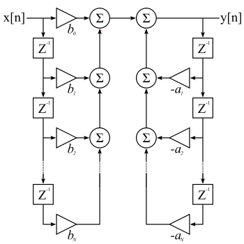 Les filtres numériques peuvent être réalisés à l'aide de trois éléments ou opérations de base, soit l'élément gain, l'élément de sommation et le retard unitaire ; ces éléments sont suffisants pour réaliser tous les filtres numériques linéaires possibles. La réalisation présentée dans la figure 1 est une réalisation directe de type 1 du filtre RII.