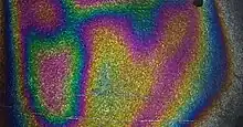 Puisque le déphasage dépend de la longueur d'onde (qui elle-même est reliée à la couleur du rayon), on obtient des interférences constructrices pour certaines couleurs et destructrices pour d'autres. Dans un miroir dichroïque, la « tache d'huile » est en fait une superposition de revêtements optiques que l'on dépose sur une plaque de verre. Les différentes couches sont isolantes et choisies de sorte que leur indices soient alternativement supérieurs et inférieurs à celui du substrat[8].
