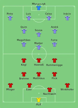 Les Bavarois dominent la première période en faisant parler leur puissance athlétique. Ils occupent et confisquent le ballon : leur ouverture du score à la 24e minute, sur une tête de Ludwig Kögl, habituellement sur le banc de touche, vient conclure leur supériorité. Dominée, la formation portugaise va réussir à renverser la vapeur dans le dernier quart d'heure, grâce à une réalisation de Rabah Madjer qui réalise un geste qui portera par la suite son nom, une « Madjer ». L'attaquant algérien marquera du talon dos au but alors que le gardien bavarois avait la vision masquée par ses défenseurs. Ce même Madjer, victime d'une blessure au mollet, sort quelques instants avant de rentrer de nouveau sur la pelouse. Quelques instants plus tard, il délivre une passe décisive à Juary qui double la mise d'une volée[1].