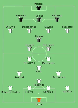 Le début du match est fermé, la Juventus se livrant en premier à l'offensive. Néanmoins, le trio offensif Zidane-Inzaghi-Del Piero subit des ratés. Le Real Madrid résiste à se faire aspirer par l'offensive pour ne pas s'exposer aux contres efficaces des Italiens. Le dispositif espagnol reste en place, Sanchís et Hierro nettoient les schémas offensifs anticipés d'une Juventus aphone quand Mijatović et Morientes partent en éclaireurs à l'orée de la surface italienne. À la 26e minute, Mijatović s'échappe sur la gauche. Son centre tendu est repris par Raúl qui manque le cadre de peu[1].
