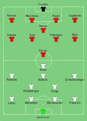 Dans cette finale inédite, le jeu est assez équilibré, les deux équipes observant un round d'observation en début de match. La situation se décante à la 33e minute avec le but de Fernando Torres, qui inscrit le seul but du match. La sélection ibérique prend ensuite le jeu à son compte, étant rarement inquiétée par la formation de Joachim Löw. Dans les dernières minutes, l'Espagne campe dans la moitié de terrain d'une équipe allemande en panne d'inspiration et se dirige vers son second sacre en Championnat d'Europe.