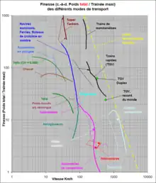 Plus généralement, la notion de finesse peut s'appliquer avantageusement à tous les modes de transport (de marchandise ou de passagers) pour permettre l'évaluation de leur rendement énergétique. En effet, le rendement de chaque véhicule est le quotient du poids de ce véhicule sur les forces de traînée qui le freinent (diagramme de Gabrielli-von Kármán[13] ci-contre). En dressant ce diagramme[14], après avoir pris acte de l'impossibilité de mesurer la valeur que chaque homme accorde à la vitesse de ses déplacements, Karman et Gabrielli ont posé les fondations d'un système de mesure de l'économie des déplacements (de marchandise ou d'humains), ce système de mesure demeurant valide plus de 70 ans après sa création[15].