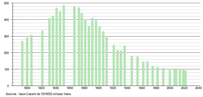 L'évolution du nombre d'habitants est connue à travers les recensements de la population effectués dans la commune depuis 1793. Pour les communes de moins de 10 000 habitants, une enquête de recensement portant sur toute la population est réalisée tous les cinq ans, les populations légales des années intermédiaires étant quant à elles estimées par interpolation ou extrapolation[16]. Pour la commune, le premier recensement exhaustif entrant dans le cadre du nouveau dispositif a été réalisé en 2008[17].
