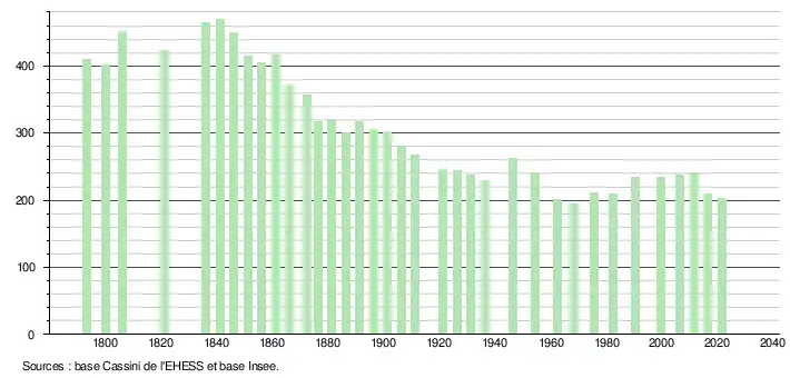 L'évolution du nombre d'habitants est connue à travers les recensements de la population effectués dans la commune depuis 1793. Pour les communes de moins de 10 000 habitants, une enquête de recensement portant sur toute la population est réalisée tous les cinq ans, les populations légales des années intermédiaires étant quant à elles estimées par interpolation ou extrapolation[20]. Pour la commune, le premier recensement exhaustif entrant dans le cadre du nouveau dispositif a été réalisé en 2006[21].